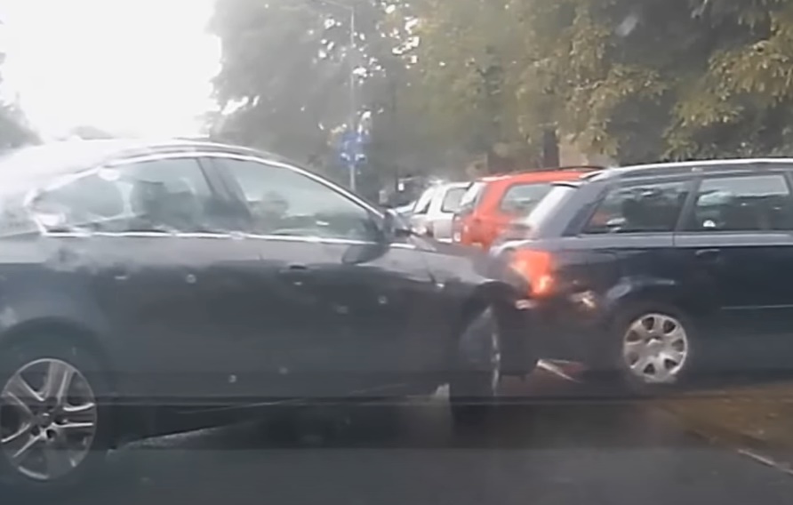 Izbraucot no stāvvietas, Audi uzsit pa Opel bamperi, taču cietušais to neņem ļaunā un aizbrauc tālāk pat neizkāpjot un nenovērtējot iespējamo skādi.