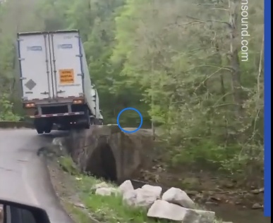Kravas auto šoferis Lielbritānijā, šķiet ir aizmirsis par visa sastāva gabarītiem, tādēļ pirms bīstamā un šaurā tilta pat nepiebremzē.