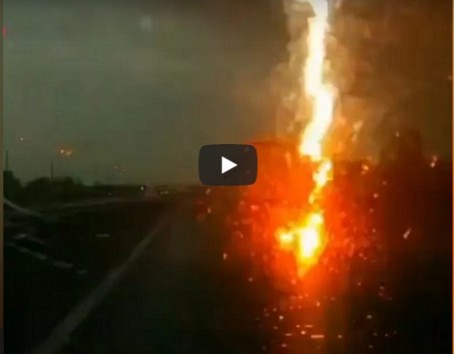 Uz autoceļa netālu no Krievijas pilsētas Kolumnas, negaisa laikā zibens izlāde notiek tieši virs braucoša kravas auto.