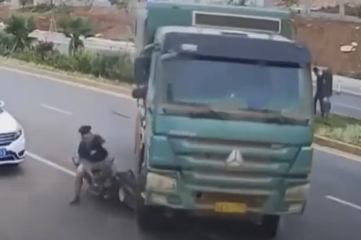 Mototransporta vadītājs iebrauc kravas auto aklajā zonā un pakļūst zem riteņiem, taču viņām paveicas palikt neskartam.