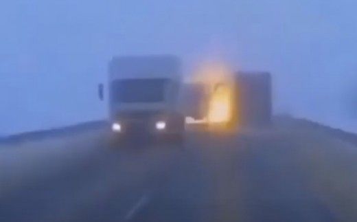 Zibenim līdzīgais uzliesmojums rodas brīdī, kad kravas furgons iebrauc pretējā joslā un saduras ar autobusu.