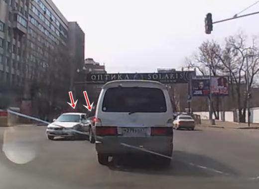 Sagaidījis zaļo signālu, vieglais auto uzsāk pagriezienu pa kreisi, taču saduras ar pretimbraucošo (skatīt no 2:50).