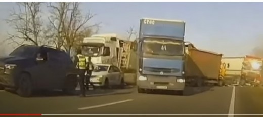Renault kravinieks piebremzē pirms šķēršļa, lai palaistu garām pretimbraucošo transportu, taču viņam sekojošais smagsvars šo momentu nokavē.