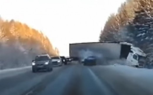 Kravas auto šoferis nokavē brīdi, kad transportlīdzekļi viņam priekšā piepeši strauji samazina ātrumu, iespējams, sliktā ceļa seguma dēļ.