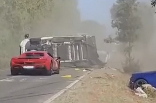 Lamborghini un Ferrari sadursmē apgāžas furgons ar diviem ceļotājiem (+ VIDEO)