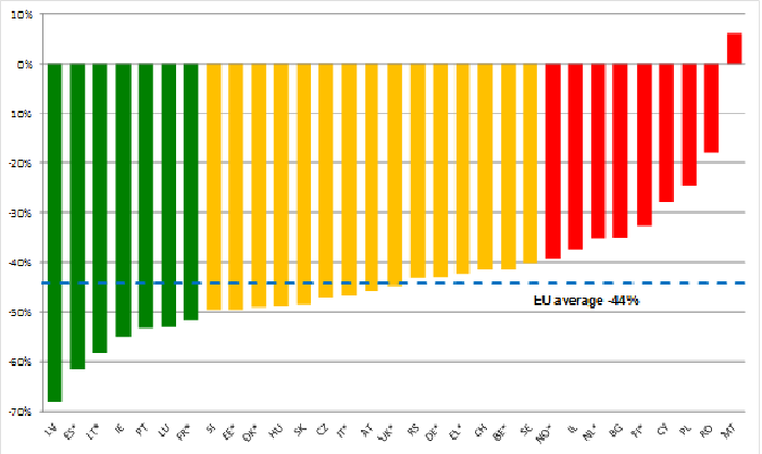 Ziņojumā teikts, ka 2011.gadā Latvija bija tā ES valsts, kurā panākts visaugstākais ceļu satiksmes negadījumos bojā gājušo skaita (īpatsvara) samazinājums, proti par 18%, salīdzinot ar 2010.gadu. Mums seko Spānija – samazinājums par 17%, kā arī Rumānija un Bulgārija – katrā valstī samazinājums par 15%. Savukārt kopumā pētījuma dalībvalstīs vidējais ceļu satiksmes negadījumos bojā gājušo samazinājums bija tikai 3% jeb 936 cilvēki (no 32 601 bojā gājušajiem 2010.gadā uz 31 665 – 2011.gadā).