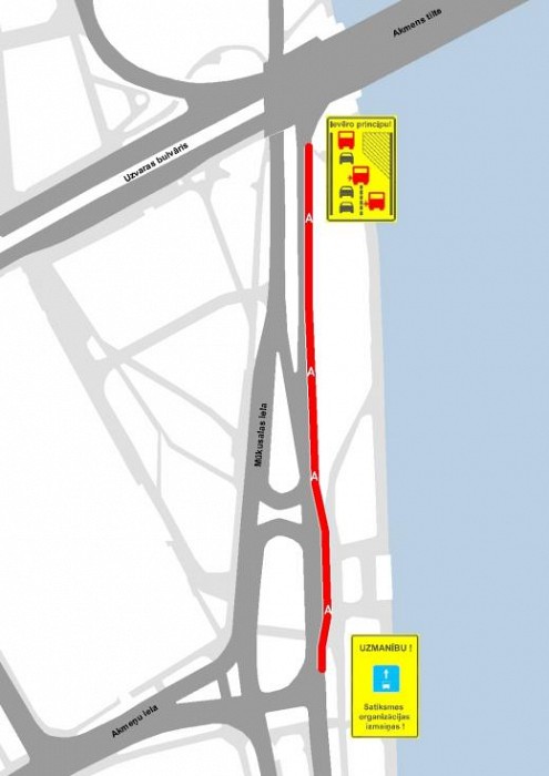 Sabiedriskā transporta josla sākas no apgriešanās vietas pretī Nacionālajai bibliotēkai līdz Akmens tilta pieslēgumam. Autovadītājiem izvietots plakāts ar aicinājumu dot priekšroku sabiedriskajam transportam. Šādas satiksmes organizācijas izmaiņas veiktas pēc uzņēmuma „Rīgas Satiksme” lūguma.