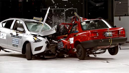 Video patiešām uzskatāmi redzams, cik 25 gadus vecā Nissan virsbūve ir neizturīga, kā trieciena rezultātā tā salokas un deformējas, iespiežot vadītāju, kamēr jaunā "Nissan" salons praktiski paliek bez izmaiņām.