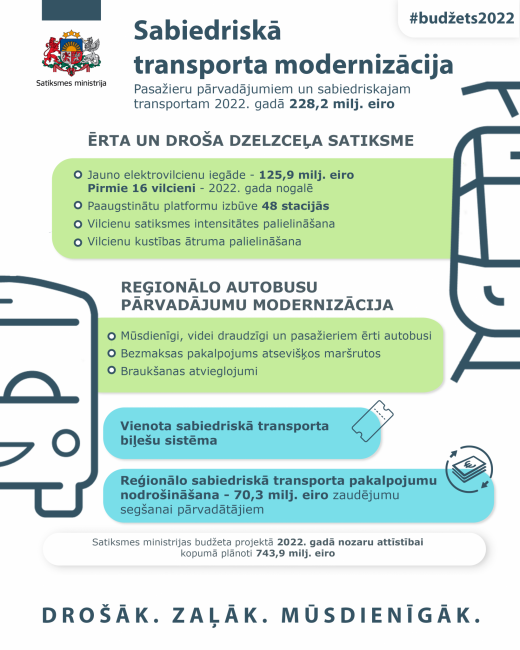 Klimata mērķu sasniegšanai arvien lielāka uzmanība tiek pievērsta videi draudzīgam transportam un Latvijā, tāpat kā citās Eiropas Savienības valstīs, dzelzceļš tiek attīstīts par sabiedriskā transporta sistēmas mugurkaulu. Viens no nozīmīgākajiem 2022. gada projektiem ir jaunu elektrovilcienu iegāde, kam budžetā paredzēti 125,9 milj. eiro. Plānots, ka nākamgad tiks piegādāti pirmie 16 elektrovilcieni, kas nodrošinās pasažieriem ērtāku pārvietošanos, tostarp arī draudzīgāku velo pārvietošanu. Vienlaikus, ieviešot regulāro intervāla grafiku, vilciens kursēs biežāk, atsevišķās līnijās ar reisu skaita palielināšanos līdz 50%. Nākamgad plānots sākt darbu pie paaugstinātu platformu izbūves 48 dzelzceļa stacijās, kā arī dzelzceļa infrastruktūras modernizācijas vilcienu kustības ātruma palielināšanai.