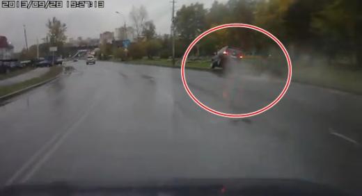 Slapjos un slidenos ceļa apstākļos "VW Touareg" vadītājs izvēlas nepareizu ātrumu.