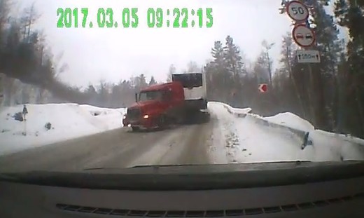 Video autors saduras ar pretimbraucošo kravinieku, kas izbraucot no līkuma, ieslīd viņa brauktuves pusē.