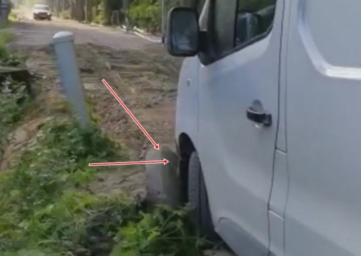Iela ir atvērta braukšanai, taču visapkārt mētājas pēc remontiem palikušie būvmateriāli, ceļa pamats nav nostiprināts, bet, kas pats bīstamākais - atstāta atvērta ūdeņu novadīšanas sistēmas aka, kur tad arī ieslīdējis video redzamā busiņa priekšējais ritenis.