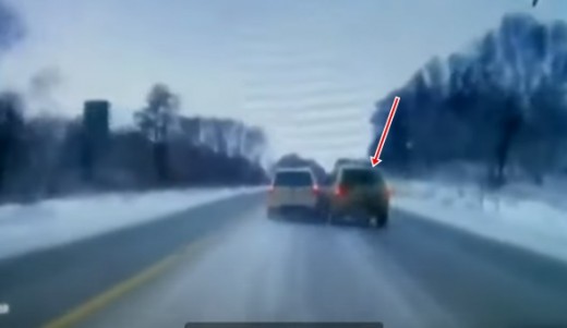 Labajā pusē braucošais apvidus auto pēkšņi taranē automobili, kas cenšas to apdzīt.