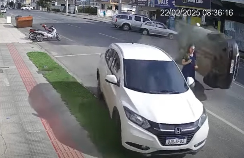 Video no Brazīlijas: sieviete paliek neskarta, kad no aizmugures pa ielu braucošs pikaps ietriecas automašīnā, kurai viņa iet garām.