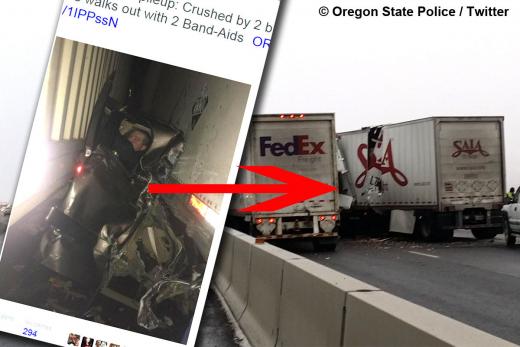 Šī fotogrāfija apceļojusi visu pasauli - izskatās briesmīgi, taču varat neuztraukties - starp diviem smagsvariem saspiestais Chevrolet pikapa vadītājs Kalebs Vitbijs avārijā izdzīvo praktiski bez traumām.