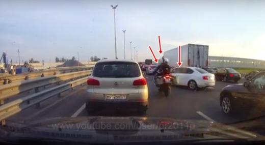 Izbraucot no savas rindas, auto vadītājs acīmredzot negaidīja, ka starp rindām varētu braukt motocikls, tāpat kā divriteņu transportlīdzeklis, kas brauc salīdzinoši ātri, neparedzēja, ka kāds varētu izgriezt tam priekšā.