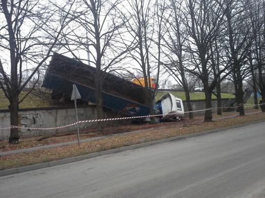Rīgā no Brasas tilta nobraukusi un apgāzusies kravas automašīna Foto: Viesturs Kleinbergs, iAuto.lv