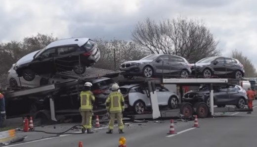 Vācijā avarējis autovedējs ar jauniem BMW; glābšanas operācija (+ VIDEO)