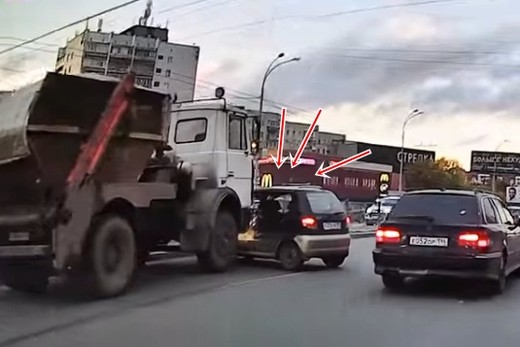 Nepamanīja - smagā mašīna aizstumj mazauto (+ VIDEO)