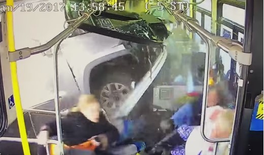 Pikaps taranē autobusu, ietriecoties salonā (+ video)