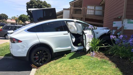 Tesla krosovers negaidīti paātrinās un ietriecas ēkas sienā (+ video)