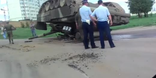 Krievu tanks "uz mutes" - armijas vilcējs pazaudē bīstamu kravu (+ video)