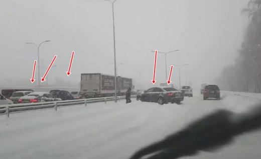 Paralizētā Rīgas - Jūrmalas šoseja - mašīnas stāv, ceļa tīrītāju nav (+ video)