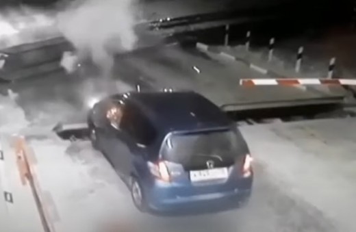 Redzot, ka dzelzceļa pārbrauktuves barjeras nolaistas, vadītājs cenšas apbraukt tās pa pretējo joslu, taču automātiku piemānīt neizdodas.