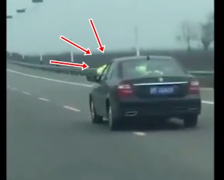 Video autors nofilmējis dramatisku skatu uz automaģistrāles - mašīnu, kas traucas ar pārsegam pieķērušos policistu, kurš, acīmredzot mēģinājis autobraucēju-likumpārkāpēju aizturēt.