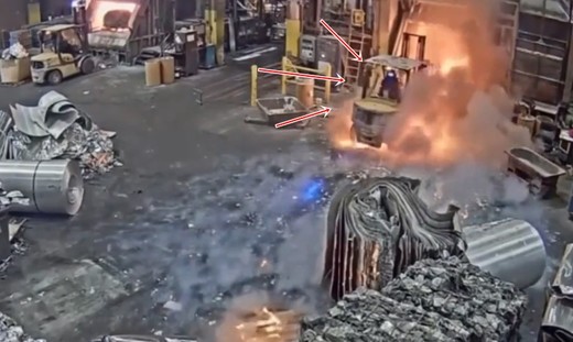 Tērauda lietuves darbinieks rīkojas neuzmanīgi un piedzīvo bīstamu situāciju, kad izkausētā masa izšļācas no krāsns un aizdedzina mini iekrāvēju.