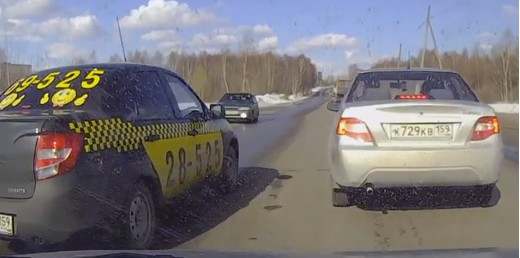 Kad abi priekšā esošie sāk bremzēt, lai pagrieztos pa kreisi, video autoram vairs nav kur palikt.