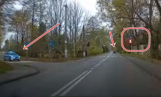 Policija uzmana samērā vientuļu vietu, kur uzstādīts luksofors un soda autovadītājus, kas neredzot gājējus, izlemj ignorēt aizliedzošo signālu.