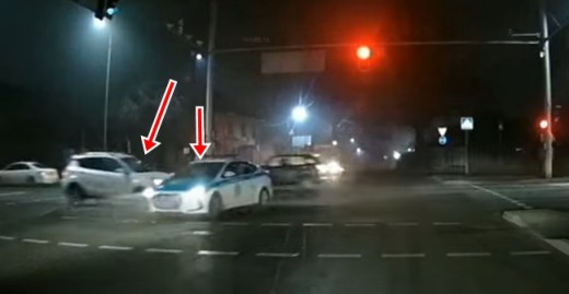 Veicot kreiso pagriezienu, Almati (Kazahstāna), policijas patruļauto aizšķērso ceļu automašīnai, kas brauc tiem pretī. Uzreiz pēc avārijas policisti ieslēdz bākugunis.