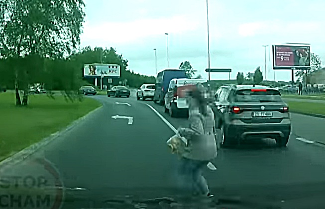 Meitene dodas pāri ceļam neatļautā vietā, turklāt nepārliecinoties par drošību, kā rezultātā gandrīz pakļūst zem riteņiem.