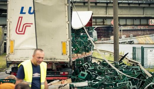 Rīgā apgāzusies kravas automašīna ar alu (+ foto)