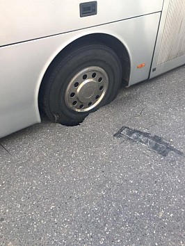 Rīgas centrā, neizturot satiksmes radīto slodzi, zem tūristu autobusa ielūzis asfalta segums, kas sedzis siltumtīkla trasi.