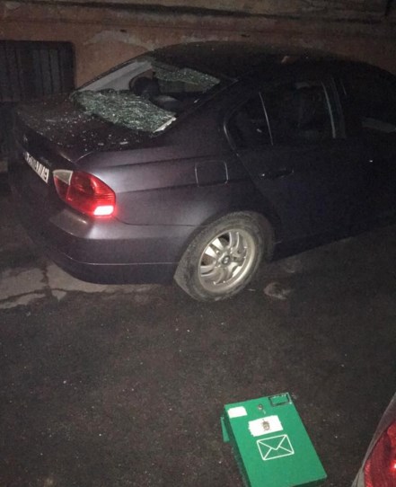 Kaimiņa automašīnai izsists aizmugurējais stikls, kā arī apskādēta transportlīdzekļa virsma, liecina sociālajā tīklā "facebook.com" publicētās fotogrāfijas.