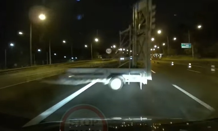 Polijā autovadītājs, kurš ar savu automašīnu pārvietojas pa ātrgaitas šosejas kreiso joslu, negaidīti ierauga sev priekšā ceļa remontētāju atstāto piekabi.