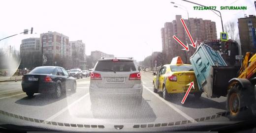 Kurioza divu speciālās nozīmes transportlīdzekļu sadursme, kurā traktors no aizmugures uzgāž mazmājiņu taksometru pakalpojumu sniedzējam.