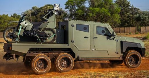 Africa Aerospace and Defence Show (AAD2022) Dienvidāfrikā tiek demonstrēts sešriteņu bruņu pikaps ar dronu aizsardzību.