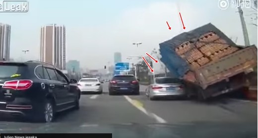 Kravas auto nespēj nobremzēt pirms luksofora un, lai izvairītos no sadursmes ar vieglo automašīnu, izvēlas vissliktāko variantu - uzbraukt uz apmales un apbraukt to pa labo pusi.