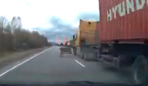 Mēģinot izvairīties no detaļas, kas atdalās no smagā auto konstrukcijas, vieglās mašīnas šoferis zaudē kontroli un piedzīvo smagu avāriju.