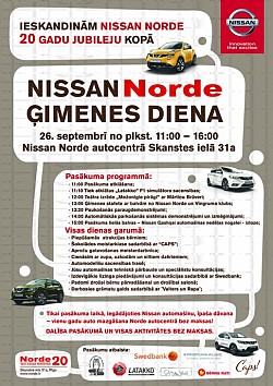 Nissan Norde pasākumā visas dienas garumā, sev tīkamas nodarbes atradīs katrs – gan mamma un tētis, gan bērni, sākot ar automašīnas pārbaudi, un beidzot ar ģimenes stafetēm. Gaidām viesus, kuri jau brauc ar Nissan automašīnām, domā par to iegādi vai arī, kuriem pat nav autovadītāja apliecības.