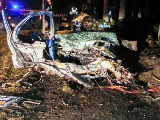 Jūrmalā, Asaru prospektā, automašīna "BMW 740" nobrauca no ceļa, sadūrās ar diviem apgaismes stabiem un ietriecās kokā. Pēc sadursmes automašīna sadalījās vairākās daļās. No gūtajām traumām gāja bojā 1991., 1992., 1993. un 1994. gadā dzimuši puiši. Foto: Valsts Policija