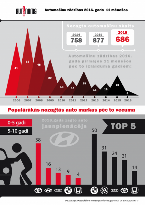 Automašīnu aizsardzības sistēmu eksperta “Autonams” kopsavilkums par 2016. gada 11 mēnešos veiktajām automašīnu zādzībām liecina, ka šogad pieaudzis vidējās klases automašīnu zādzību skaits.