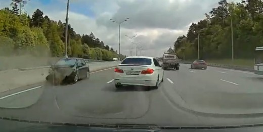 Steidzīgs BMW vadītājs, kas lavierē starp rindām, aizķer kādas sievietes vadītu Toyota, kas sagriežas un ietriecas barjerā (var no 0:15).