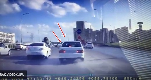 Baltās automašīnas vadītājs nedaudz piebremzē un, šķiet, pamaina trajektoriju, bet tai sekojošais žiguļa vadītājs tam nav gatavs (No 0:15)