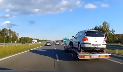 Volkswagen Passat vadītājs nonāk sarežģītā situācijā, kad uz ātrgaitas maģistrāles piekabe ar uzkrauto Golf sāk svaidīties.