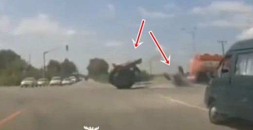 Traktorists pārāk dziļi iebrauc krustojumā, kur lauksaimniecības tehniku aizķer kravas auto un pārdala uz pusēm.