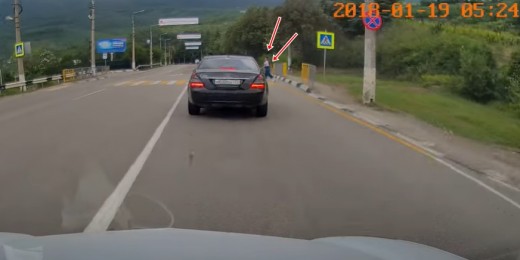 Video autors dusmojas uz trīs priekšā braucošo transportlīdzekļu vadītājiem par to, ka viņi nobremzē, lai palaistu gājēju.